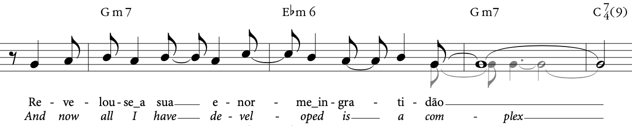 ... the second line Tom sings, “sem Vinicius pra fazer a poesia,” sounds the same as this section from Desafinado: